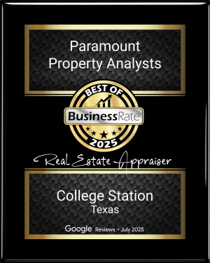 Paramount Property Analysts is proud to be recognized as a Best of 2025 College Station Award Winner in the Real Estate Appraiser category. BusinessRate awards this distinction based on verified Google Reviews, measuring customer satisfaction, service quality, and overall reputation against local competitors.